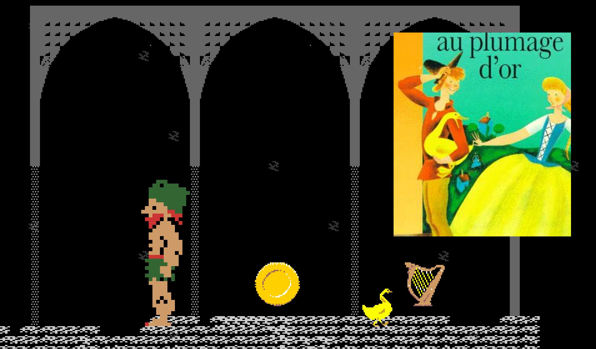 Golden goose, harp and coin